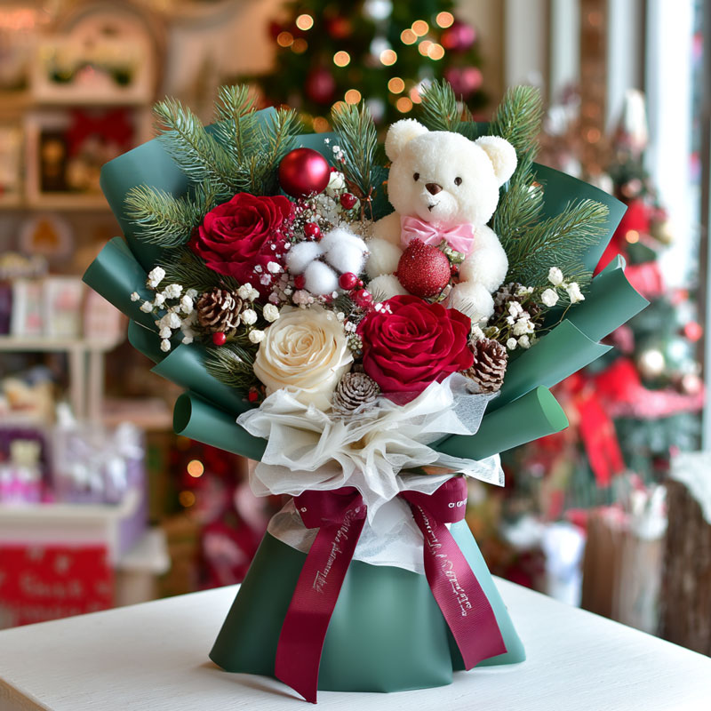 This enchanting Christmas bouquet blends playful charm with romantic elegance, perfect for gifting to loved ones in Singapore. It features lush deep-red roses (symbols of warmth) paired with soft cream roses, framed by fresh evergreen pine sprigs, rustic pinecones, fluffy white cotton, and delicate baby’s breath for texture. The star of the arrangement is an adorable plush teddy bear (adorned with a pink bow), plus shiny red baubles that add a festive glint. Wrapped in rich forest-green paper with a sheer white ruffle layer, and tied with a burgundy ribbon, the bouquet balances cozy holiday vibes with sophisticated style. Ideal for surprising kids, partners, or friends, it brings joyful, huggable Christmas spirit to any space—long-lasting and full of whimsical charm.